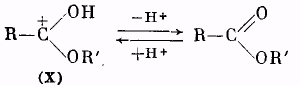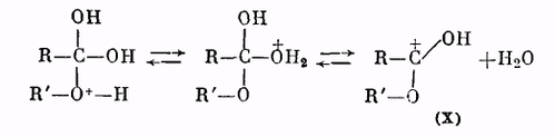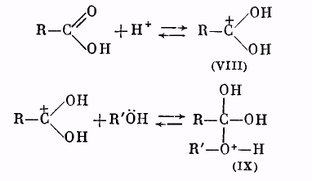 Роль катализатора заключается в протонировании карбонильного кислорода: при этом карбонильный атом углерода становится более положительным и более «уязвимым» по отношению к атаке нуклеофильного агента, которым является молекула спирта. Образующийся вначале катион (VIII) присоединяет молекулу спирта за счет неподеленных электронов кислородного атома, давая катион (IX):