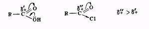 Карбоновые кислоты, как видно из вышесказанного, реагируют со спиртами относительно медленно. Это объясняется слабой активностью карбонильной группы в кислотах по отношению к нуклеофильным агентам по сравнению с активностью той же группы в ангидридах и хлорангидридах кислот, поскольку +М-эффект гидроксильной группы приводит к уменьшению положительного заряда карбонильного углерода