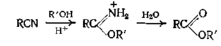 Хотя от нитрилов можно перейти к сложным эфирам через амиды, обычный метод состоит в превращении их в иминоэфир, который можно выделять в качестве промежуточного соединения, а можно и не выделять. Для этой реакции применяют различные катализаторы, такие, как хлористый водород, бромистый и йодистый водород, серную кислоту и моногидраты бензол- и толуолсульфокислот. Следует отдать предпочтение аренсульфокислотам по сравнению с хлористым водородом или серной кислотой. С хлористым водородом получаются, более высокие выходы, чем с бромистым и йодистым водородом. Как показывает приведенное уравнение реакции, если исключить из участия в реакции воду, можно получить иминоэфиры. В некоторых случаях для реакции, ведущей к образованию иминоэфира, вода не нужна совсем, а иногда в отсутствие воды реакция не идет.