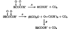 Ряд смешанных ангидридов из алифатических кислот разлагается с образованием сложных эфиров по пути А, а смешанные ангидриды ароматических кислот разлагаются по пути либо А, либо Б. При 250 °С происходит также реакция В. Трифторуксусная кислота и фениловый эфир хлормуравьиной кислоты при смешивании образуют фениловый эфир трифторуксусной кислоты с выходом 75—80%. Рассмотренные реакции декарбоксилирования, по-видимому, протекают через промежуточное циклическое состояние, причем происходит сдвиг электронов в цикле.