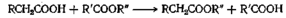 Переэтерификация представляет собой равновесную реакцию, которую можно сдвинуть в прямом направлении, применяя избыток одного из реагентов или, что предпочтительно, удаляя один из компонентов — RCOOR" или R'OH. Если температура кипения R'OH ниже, чем R"OH, можно проводить разделение, при помощи фракционирования: иногда для удаления получающихся продуктов пользуются образованием азеотропных смесей. Катализаторами такой реакции обмена служат кислоты, например серная или толуолсульфокислота, или основания, например алкоголяты алюминия. Как правило, превращение лучше протекает с первичными спиртами, причем наиболее реакционноспособен метиловый спирт, хотя в некоторых случаях с успехом можно применять вторичные спирты.