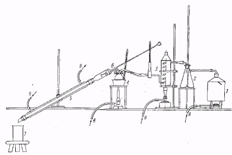 1 – парообразователь, 2 – водоотделитель, 3 – пароперегреватель, 4 – перегонный сосуд в масляной бане, 5 – холодильник с широкой трубкой. 6 – приспособление для проталкивания твердого вещества, застрявшего в холодильнике, 7 – приемник для дистиллята, 8 – газовая горелка, 9 – водяное охлаждение.