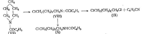 Более удовлетворительный способ размыкания цикла некоторых циклических аминов заключается в нагревании соответственных бензоильных производных с пятихлористым фосфором. Например, бензоилпиперидин (VII) гладко превращается в этих условиях в соединение (VIII), которое при гидролизе дает бензоиламино-ξ-хлорпентан (X) и дихлорпентан (IX)