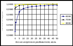 Рассчитаем зависимость равновесной степени конверсии от степени разбавления водой – инертным разбавителем при 800К, 700К, 600К и пониженном давлении 0,5атм. Результаты расчетов приведены в таблице.