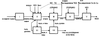Степень окисления карбида в циклонной пыли 90%, в пыли рукавного фильтра 99%, необходима степень окисления в огарке 98%. Металлы Со, Zn, Cu, Fe окисляются нацело. Пыль рукавного фильтра и огарок поступают на выщелачивание, а пыль циклона идет на грануляцию. Не прореагировавший карбид также возвращается на грануляцию, т. к. при дальнейшем разделении присутствует как балласт.