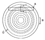 Рис.1. Схема текстурирования нанотрубок в матрице в результате приложения сдвиговых усилий: а) направление ориентации УНТ; б) ожидаемая ориентация УНТ; в) вращение стального диска