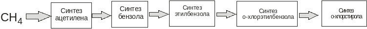Синтез о-хлорстирола состоит из нескольких последовательных стадий, в процессе синтеза мы получим ацетилен, бензол, стирол и другие органические вещества. Сам процесс синтеза схематически изображен на рисунке (рис. 1).