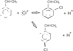 Мы рассмотрели основные физические свойства о-хлорстирола. Коснемся также его основных химических свойств. Его химические свойства обусловлены наличием в молекуле о-хлорстирола ароматического ядра и ненасыщенной группы. Как представитель ароматических соединений о-хлорстирол будет вступать во все реакции присущие ароматическим соединениям. Он будет реагировать с водородом, галогенами, галогеноводородами с получением циклических насыщенных соединений.