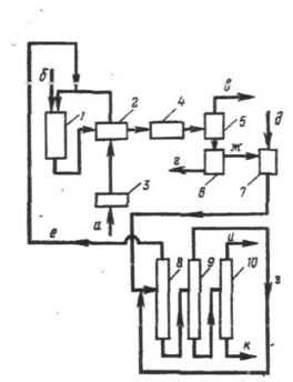 . Контактный газ из реактора поступает в межступенчатый подогреватель, где подогревается до 580-630
