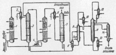 Из контактных газов после второй ступени окисления окись этилена извлекают водой в абсорбере 7 второй ступени. Из абсорберов 3 и 7 водный раствор окиси этилена через теплообменник 8 направляют в отпарную колонну 9. Отгоняемая из этой колонны паро-газовая смесь поступает через дефлегматор 10 на разделение в ректификационную колонну 11. Окончательная очистка окиси этилена от CO2 производится в колонне 14. Получаемый по этому способу продукт представляет собой 99,5%-ную окись этилена.