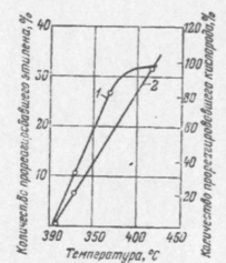 Количество реагирующего кислорода сначала быстро растет с повышением температуры – при 360°С в реакцию вступает более 80% исходного кислорода. Выше этой температуры кривая расхода кислорода