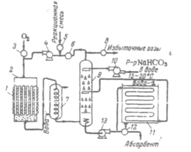 1) змеевик для обогрева и охлаждения реактора, 2) реактор, 3) вентиль для подачи кислорода, 4) циркуляционный насос, 5) вентиль для подачи реакционной смеси, 6) вентиль для подачи рециркуляционного газа, 7) холодильник. 8) вентиль для отвода избыточных газов, 9) скруббер, 10) насос орошения скруббера, 11) холодильник для адсорбента, 12) вентиль для подачи адсорбента на ректификацию, 13) насос для отвода адсорбента.