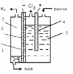 То есть на аноде идет образование хлора, а у катода – водорода и едкого натра. При электролизе наряду с основными описанными процессами могут протекать и побочные, один из которых описывается уравнением (б). Помимо этого, хлор, выделяющийся на аноде, частично растворяется в электролите и гидролизуется по реакции
