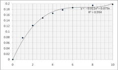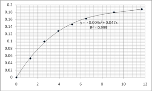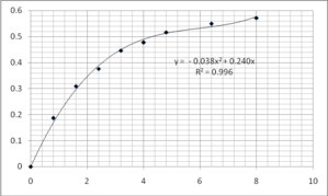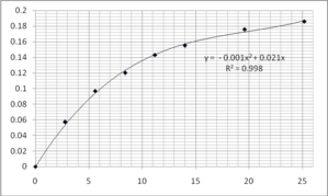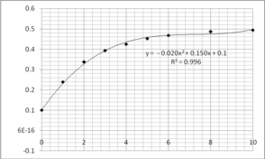При описании кинетического уравнения полиномом первой степени теряется физический смысл: скорость реакции постоянна в любой момент времени. Используя полином второй степени можем получить отрицательные концентрации при бесконечном времени реакции. Для описания экспериментальной зависимости выберем полином третьей степени, так как он наипростейший из не противоречащих физическому смыслу.