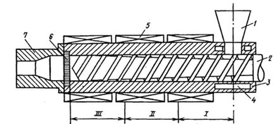 1. Зона питания (I). Поступающие из бункера гранулы или порошок полимера заполняет межвитковое пространство шнека зоны I и уплотняется.