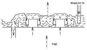 Схема работы колпачковой тарелки изображена на рис. 1.12. Выходящие через прорези колпачки пузырьки пара сливаются в струйки, которые проходят через слой жидкости, находящейся на тарелке, и над жидкостью образуется слой пены и брызг, – основная область массообмена и теплообмена между паром и жидкостью на тарелке.