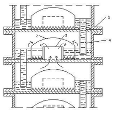 Приток и отвод жидкости, а также высоту жидкости на тарелке регулируют при помощи переливных трубок 4, которые расположены на диаметрально противоположных концах тарелки; поэтому жидкость течет на соседних тарелках во взаимно противоположных направлениях.