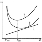 Рис. 2.16. К определению оптимального флегмового числа: 1 – эксплуатац. расходы; 2 – капитальные затраты; 3 – общие затраты на ректификацию.