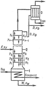 Рис. 2.15. К составлению материального баланса ректификационной колонны: 1 – куб–испаритель; 2 – колонна; 3 – дефлегматор.