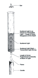 Джексон воспользовался этой шкалой для работы с существовавшим тогда прибором диафанометром и создал то, что известно под названием "свечной турбидиметр Джексона". Он состоял из специальной свечи и плоскодонной колбы. Джексон откалибровал его в единицах ppm по мутности взешенного кремнезема. Для определения мутности образец медленно наливали в колбу до тех пор, пока изображение пламени, наблюдаемое сверху не превращалось в бесформенное свечение (Рис. 1).