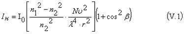 где Iн и I0 - интенсивности рассеянного и падающего света; n1 и n2 - коэффициенты преломления частиц и среды; N - общее количество светорассеивающих частиц; х - объем одной частицы; л - длина волны падающего света; r - расстояние до приемника рассеянного света; в - угол между падающим и рассеянным светом. В условиях нефелометрического определения ряд величин остается постоянным и уравнение (V.1) переходит в