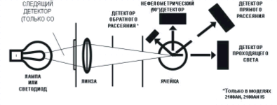 В основе принципа работы турбидиметров 2100N и 2100AN лежит принцип пропорциональной зависимости между количеством рассеянного света и количеством взвешенных частиц в веществе. Свет от галогеновой лампы, работающей при температуре 2700 К, собирается тремя поликарбонатными линзами. Поликарбонат устойчив к температурному воздействию, создаваемуму этой лампой. Линзы разработаны таким образом. Чтобы собрать как можно больше света и спроецировать изображение нити на измерительную ячейку. Синий инфракрасный фильтр сдвигает пик чувствительности детектора в область 400 - 600 нм в соответствии с требованиями EPA. В 2100AN вместо синего ИК фильтра можно использовать интерференционную решетку, чтобы проводить определение мутности в квазимонохроматическом свете. Ряд перегородок между линзами и ячейкой задерживает свет, рассеянных на поверхности линз, и препятствует попаданию постороннего света на детектор. Каждая следующая перегородка (кроме последней) имеет щель меньше, чем у предыдущей. Последняя перегородка имеет большое отверстие, чтобы луч не мог высветить край отверстия и не появлялось постороннего света.