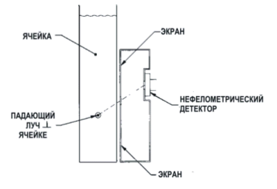 Детектор, расположенный под углом 90° к направлению прохождения луча, определяет рассеяние света по нормали к падающему. Данный детектор установлен вне плоскости, которую образуют падающий луч и детекторы. Установка под углом и дополнительный экран задерживают свет, рассеиваемый на стенках ячейки, но позволяют проходить свету, рассеянного образцом. Сигналы детекторов математически обрабатываются и из соотношения выводится величина мутности. В 2100AN установлен четвертый детектор обратного рассеяния, который определяет интенсивность света, рассеянного под углом 138° к номинальному направлению.