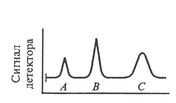 Рисунок 2.1. Хроматограмма, полученная методом элюентной хроматографии – сорбируемость веществ увеличивается в ряду А<В<С