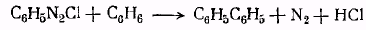 Дифенил и его производные можно также получить прибавлением сухого хлористого арилдиазония к ароматическому углеводороду, например бензолу или нафталину, смешанному с некоторый количеством безводного хлористого алюминия. Таким образом при взаимодействии хлористого фенилдиазония с бензолом образуется дифенил, а с нафталином — смесь а- и р-фенилнафталинов. Этот способ был использован также для получения фенилпиридина и фенилхинолина, причем в этих случаях отпадала необходимость прибавления хлористого алюминия