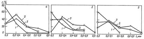 Рис. 1. Фракционный состав стекловолокна в полиамидах марок ПА 66-КС (а), ПА 610-КС (б) и ПА 6-210 КС (в), Диаметр стекловолокна-8 (1), 11 (2) и 13 мм (3).