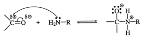 Стадия 1: Медленное присоединение нуклеофила к атому углерода карбонильной группы: