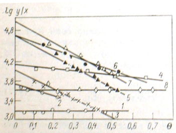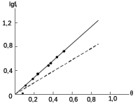 Рис.6. Зависимость lg fi от θ для молекул нитробензола, адсорбированного на угле КАД (штриховая линия рассчитана по растворимости)