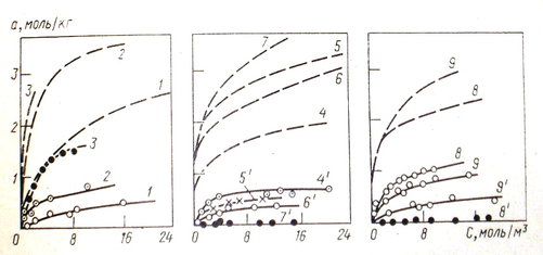 Рис. 7. Изотермы адсорбции на угле КАД катионов (1 – 3, 8, 9) и анионов (4’, 5', 6', 7', 8', 9') производных бензола: