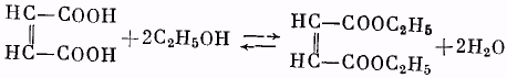 В круглодонной колбе, снабженной обратным холодильником и ловушкой для воды, смешивают 29 г малеиновой кислоты, 32 г этилового спирта, 1,5 мл концентрированной серной кислоты и 20 мл бензола. Смесь кипятят на водяной бане или колбонагревателе до прекращения выделения воды, охлаждают, переносят в делительную воронку и промывают водой, последовательно водным раствором бикарбоната натрия и еще раз водой. После этого отгоняют растворитель, который захватывает с собой и следы воды. Остаток перегоняют из колбы с дефлегматором.