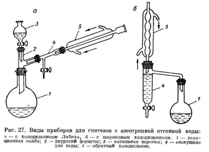 Приборы для проведения синтезов с азеотропной отгонкой воды: а – с холодильником Либиха, б – с шариковым холодильником, 1 – реакционная колба, 2 – двурогий форштосс, 3 – капельная воронка, 4 – «ловушка» для воды, 5 – обратный холодильник.