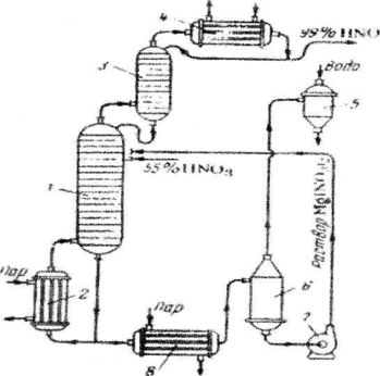 Температура кипения растворов нитрата магния примерно соответствует температурам кипения растворов серной кислоты в пределах концентрации 0-70% Н2SO4. Разбавленная азотная кислота поступает в отпарную колонну 1 тарельчатого типа. Сюда на одну тарелку выше ввода азотной кислоты подаётся подогретый до 100°С в кипятильнике 8 72%-ный раствор нитрата магния. В нижней части отпарной колонны при помощи кипятильника 2 температура раствора поддерживается в пределах 160 - 180°С. Пары, выходящие из отпарной колонны, содержат около 87% HNO3 и 13% воды и направляются в дистилляционную колонну 3. Раствор нитрата магния, содержащий около 55% Mg(NO3)2, поступает через кипятильник 8 на концентрирование до содержания 72% Mg(NC3)2. Пары воды, выделяющиеся из раствора в вакуум-испарителе 6, поступают в барометрический конденсатор 5. В дистилляционной колонне 3 происходит концентрирование 87% -ной азотной кислоты до содержания 99% HNO3. Ее пары при 86°С поступают в конденсатор 4, затем часть конденсата в виде флегмы возвращается в дистилляционную колонну, а остальное количество концентрированной кислоты передается на склад. Образовавшаяся в дистилляционной колонне 75%-ная азотная кислота стекает в отпарную колонну.