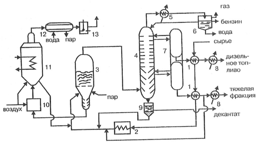 Дизельное топливо и тяжелая фракция проходят через секции отпарной колонны 7, охлаждаются в теплообменниках 1 и холодильниках 8 и отводятся как товарные продукты. Часть тяжелой фракции в виде рециркулята смешивается с сырьем и подается в реактор 3, а часть направляется на орошение нижней части колонны 4. Смесь тяжелых жидких продуктов крекинга и катализаторной пыли из низа колонны 4 поступает в шламоотделитель 9, из которого шлам возвращается в реактор 3, а богатый ароматическими углеводородами декантат отводится с установки.