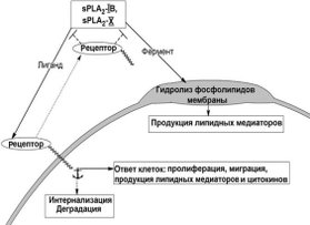 На схеме показано, как активные формы фосфолипазы sPLA2-IB или sPLA2–X проявляют свою ферментативную активность, что приводит к появлению липидных медиаторов, а также являются высокоаффинными лигандами для рецептора, локализованного в плазматической мембране. Взаимодействие фосфолипазы с рецептором мембраны приводит к индукции митогенактивированных протеинкиназ (MAPK) и соответствующего пути внутриклеточного проведения сигнала, что стимулирует различные ответы клеток: пролиферацию и миграцию клеток, синтез ими физиологически активных веществ. При потере контакта с мембраной рецептор сохраняет возможность связывать фосфолипазу, что позволяет регулировать активность последней как фермента и как лиганда.