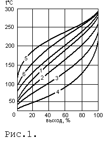 При определении фракционного состава нефть и нефтепродукты перегоняют в стандартном приборе при определенных условиях и в системе координат ("температура-отгон") строят график выкипания отдельных углеводородов и их смесей. При нагревании нефтепродукта в паровую фазу, прежде всего, переходят низкокипящие компоненты, обладающие высокой летучестью. По мере отгона низкокипящих компонентов остаток обогащается высококипящими компонентами. Чтобы сделать кипение безостановочным, жидкий остаток непрерывно подогревают. При этом в паровое пространство переходят все новые и новые компоненты с все возрастающими температурами кипения. Отходящие пары конденсируются в измерительной емкости или отбираются по интервалам температур кипения компонентов в виде отдельных нефтяных фракций. Данные разгонки представляют в виде таблицы или графика ("температура кипения - % отгона"). Линии на этом графике называют кривыми разгонки или кривыми фракционного состава. При четком делении смеси (то есть при использовании лабораторных методов периодической ректификации) получают кривые истинных температур кипения (ИТК), при нечетком делении - кривые условных температур кипения (кривые стандартной разгонки). Наиболее важными являются кривые ИТК. Их используют для определения фракционного состава сырой нефти, расчета физико-химических и эксплуатационных свойств нефтепродуктов и параметров технологического режима процессов перегонки и ректификации нефтяных смесей. Различие физико-химических свойств углеводородов используется для разделения топлив на узкие группы углеводородов и идентификации этих групп, а аддитивность некоторых свойств - для расчета количественного содержания групп углеводородов в смеси. При исследовании новых нефтей фракционный состав определяют на стандартных перегонных аппаратах, снабженных ректификационными колонками. Это позволяет значительно улучшить четкость погоноразделения и построить по результатам фракционирования кривую истинных температур кипения. Кривая ИТК показывает потенциальное содержание в нефти отдельных (узких) фракций, являющихся основой для последующей их переработки и получения товарных нефтепродуктов (автобензинных, реактивных, дизельных и энергетических топлив, смазочного масла и др.).