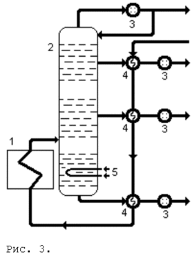 В присутствии водяного пара в ректификационной колонне снижается парциальное давление углеводородов, а следовательно их температура кипения. В результате наиболее низкокипящие углеводороды, находящиеся в жидкой фазе после однократного испарения, переходят в парообразное состояние и вместе с водяным паром поднимаются вверх по колонне. Водяной пар проходит всю ректификационную колонну и уходит с верхним продуктом, понижая температуру в ней на 10 — 20°С. На практике применяют перегретый водяной пар и вводят его в колонну с температурой, равной температуре подаваемого сырья или несколько выше (обычно не насыщенный пар при температуре 350 — 450°С под давлением 2 — 3ат).