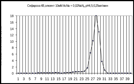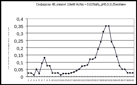 19) Хроматографирование на Sepharose CL-4B элюент 0,02% NaN3 и АсNa 10 mM pH 5,5, разделение по молекулярным массам.