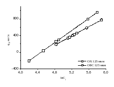 Из рисунка 6 видно, что точка перегиба кривой приходится на объем ПАК V=2,5 мл, то есть для того, чтобы оттитровать 1 мл геллана требуется 2,5 мл 2,5·10-2 моль/л ПАК. Это, в свою очередь, свидетельствует об образовании комплекса состава [ПАК]:[геллан]=1:1. В дальнейшем, исходя из состава поликомплекса по формуле: