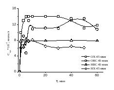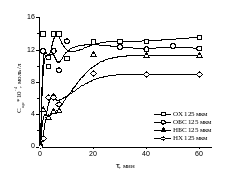 Известно, что адсорбция полимеров на поверхности обуславливается как электростатическими, так и специфическими химическими силами [31]. На рисунке 12 представлены графики зависимости концентрации адсорбированного на кернах полимеров от времени контакта.