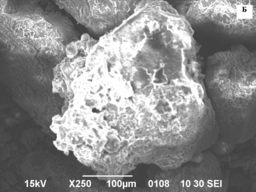 Рисунок 9 – Микрофотографии структуры поверхности предварительно необработанного керна с месторождения Харасан «до» (А) и «после» (Б) адсорбции геллана (увеличение в 700 раз)