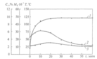 Рис. 1. Зависимость температуры (1), средневязкостной молекулярной массы (2) и содержания гель-фракции (3) от продолжительности механической обработки каучука СКС-ЗОРП