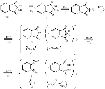 Третьему трансформу (Tf3) соответствует стратегия FGD. В результате разрываемой связи C=N в качестве синтонов образуется карбен (синтон 3) и бирадикал N2 (синтон 3'), который можно генерировать из азид-аниона, что соответствует молекуле TsN3. Наиболее простым соединением, соответствующим синтону 3, является индандион-1,3.