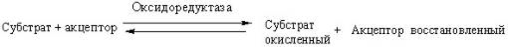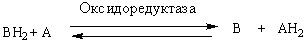 Окисление протекает как процесс отнятия атомов Н (электроном от субстрата, а восстановление – как присоединение атомов Н (электронов) к акцептору. Если обозначить рецептор буквой А, а субстрат В, то уравнение реакции окисления–восстановления при участии оксидоредуктаз примет такой вид: