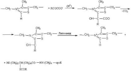Схема превращений, происходящих в активном центре фермента участием реакционноспособного карбаниона тиаминпирофосфата можно представить в виде
