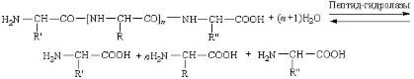 Пептид-гидролазы. Ферменты этого подкласса ускоряют гидролиз пептидных связей в белках и пептидах, при определенных условиях также синтез пептидных связей. Химизм процесса гидролиза белков и пептидов при участии пептид-гидролаз можно выразить следующей схемой: