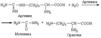 К гидролазам, кроме амидаз, относится аргиназа. При ее посредстве аминокислота аргинин гидролизуется на орнитин и мочевину: